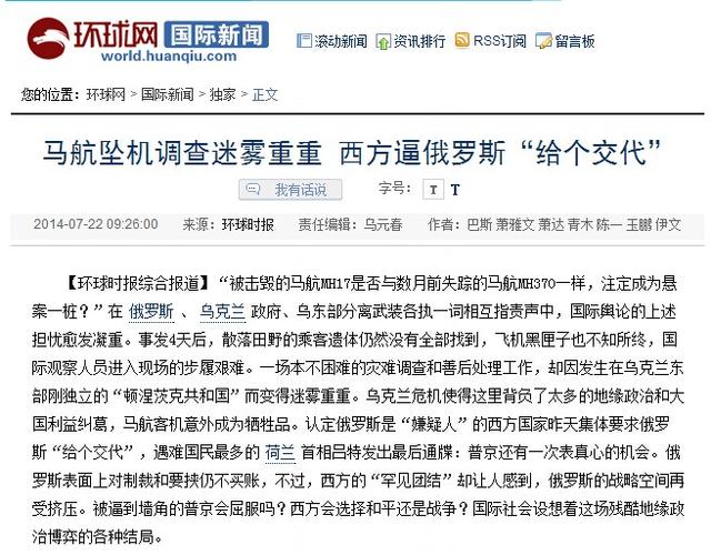 环球时报关于MH17空难的报道